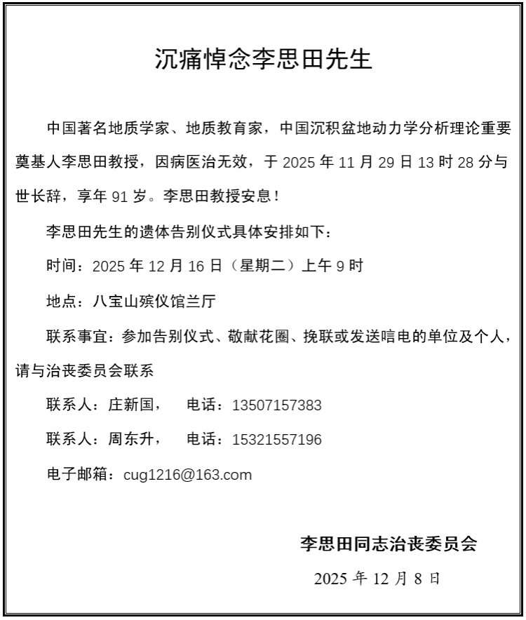 李思田(1934.11.9—2025.11.29),中国共产党党员,河北高阳人,汉族。1956年毕业于北京地质学院并留校任教。深夜福利 教授、博士生导师,多年担任沉积盆地及沉积矿产研究所所长。他毕生致力于沉积盆地与能源地质领域的科研和教学工作,是我国著名的沉积地质学家、能源地质学家、地质教育家,我国沉积盆地动力学分析理论的主要开拓者和奠基人,为国家能源安全、地学发展及人才培养做出了卓越贡献。